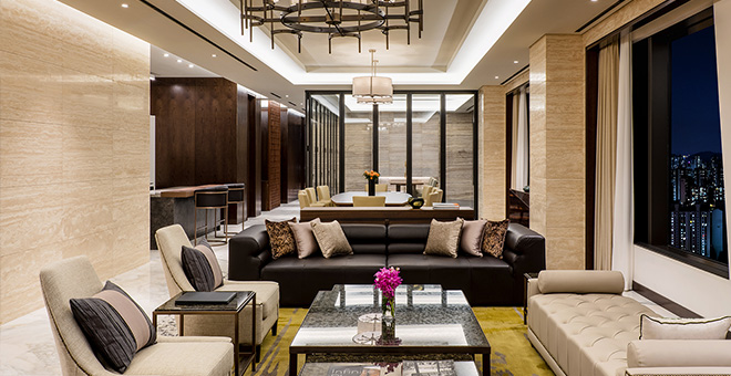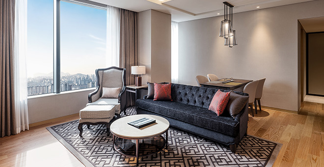 거실에서 침실까지 이어지는 통유리창을 통해 근사한 전망을 즐기실 수 있는 디럭스 스위트 룸입니다.